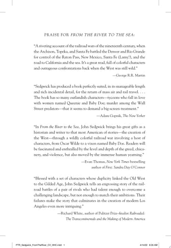 In From the River to the Sea, bestselling author John Sedgwick recounts, in vivid and thrilling detail, the decade-long fight between General William J. Palmer, the Civil War hero leading the “little family” of his Rio Grande, and William Barstow Strong, the hard-nosed manager of the corporate-minded Santa Fe. What begins as an accidental rivalry when the two lines cross in Colorado soon evolves into an all-out battle as each man tries to outdo the other—claiming exclusive routes through mountains, narrow passes, and the richest silver mines in the world; enlisting private armies to protect their land and lawyers to find loopholes; dispatching spies to gain information; and even using the power of the press and incurring the wrath of the God-like Robber Baron Jay Gould—to emerge victorious. By the end of the century, one man will fade into anonymity and disgrace. The other will achieve unparalleled success—and in the process, transform a sleepy backwater of thirty thousand called “Los Angeles” into a booming metropolis that will forever change the United States.